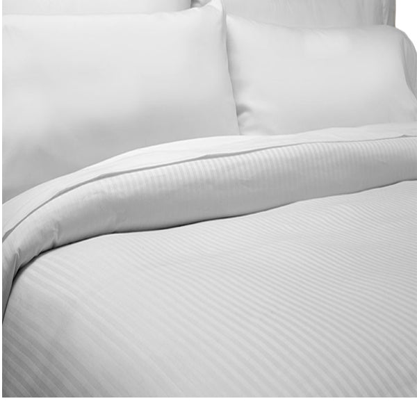 Easy care, hotel quality white tone on tone sateen stripe. T250, 50/50 cotton polyester blend.